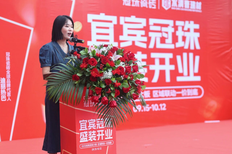 曹建材商贸有限公司副总经理、宜宾冠珠瓷砖总经理曹海祥发表致辞。她表示,宜宾冠珠拥有一支专业且高素质的服务团队,致力于为宜宾市民提供全方位、贴心、便捷的精细化服务,相信依托冠珠瓷砖强大的品牌力及高标准服务体系,宜宾冠珠定能助力业主朋友们,打造一个满意、放心、美好的家。