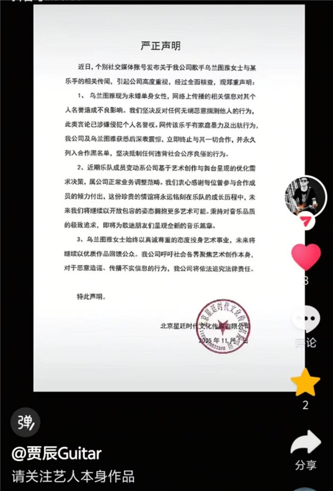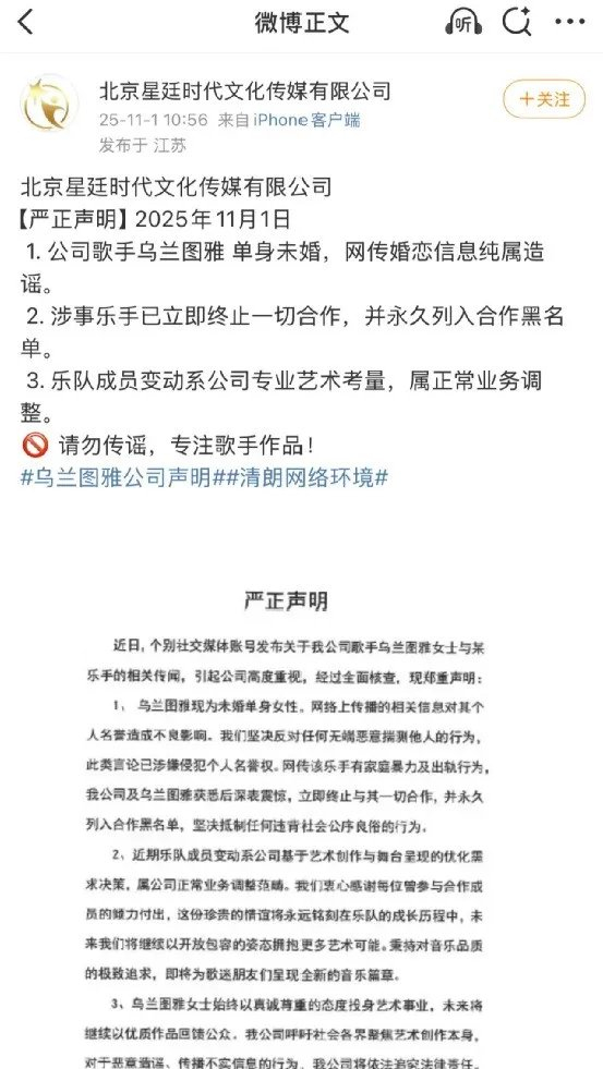 11月1日,北京星廷时代文化传媒有限公司发布严正声明,不仅澄清歌手乌兰图雅未婚单身的事实,更针对部分自媒体就乐队成员变动一事无端揣测、乱带节奏的行为作出回应,明确歌手与乐队及乐手的合作自主权不容干涉,同时披露其常年以事业为核心的工作状态,呼吁社会各界聚焦艺术创作本身,并对恶意造谣、传播不实信息的行为,保留法律追责权利。