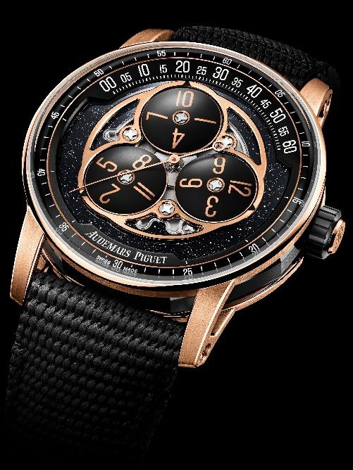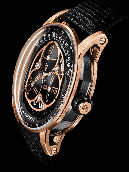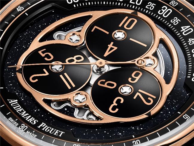 / 全新爱彼CODE 11.59系列星轮腕表将18K玫瑰金表壳、黑色陶瓷表壳中层与熠熠生辉的砂金石表盘相结合,以现代精致美学风范重新演绎历史悠久的经典复杂功能。©爱彼版权所有