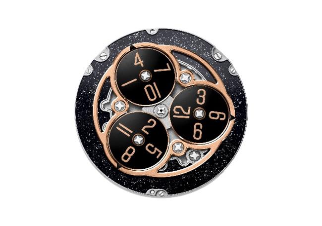 “漫游小时”时间显示主要依托每3小时旋转一圈的中央转轮带动三个铝制圆盘不断转动,三个圆盘同时亦围绕自轴旋转。每个圆盘分别标有1至12之内的4个数字,依次指向表盘上部的120度扇形分钟刻度区域。玫瑰金秒针的尖端略微弯曲,以契合圆盘的微拱轮廓,通过传统腕表的方式指示秒数,为表盘上的时间显示增添微妙而灵动的层次感。这一充满韵律感的动态设计,营造出流畅独特的读时体验,亦为传承百年的复杂功能赋予当代诠释。