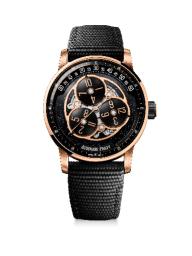 新款腕表采用18K玫瑰金表圈和表底,搭配黑色陶瓷表壳中层,彰显出爱彼CODE 11.59系列表壳极富现代风范和建筑美感的精巧构造。材质与色彩的巧妙对比亦延伸至表盘上:黑色砂金石表盘为“漫游小时”显示铺陈神秘闪烁的星河幕布;玫瑰金色数字时标与三枚乳光黑色小时盘形成鲜明撞色,同时又与中央自动摆陀桥板的金色调和谐呼应,为腕表增添迷人的纵深感和微妙的光影效果。