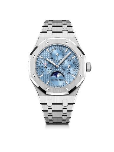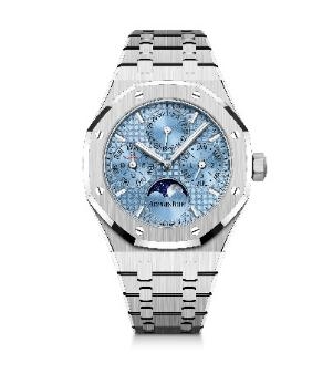 Royal Oak皇家橡树系列的第一款腕表新作则采用精钢表壳与表链,搭配由物理气相沉积(PVD)工艺制取的浅蓝色“Grande Tapisserie”大格纹表盘及同色调蜗形纹副表盘。铑色时标和18K白金荧光指针与盘面的基调形成醒目对比,确保在黑暗环境中亦可清晰读时。副表盘及抛光灰色表圈内侧精心印制黑色显示信息,为整体设计增添精致点缀。