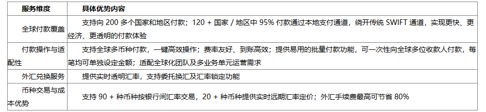 付款能力:覆盖超200 个国家和地区,超90个币种,支持批量付款。