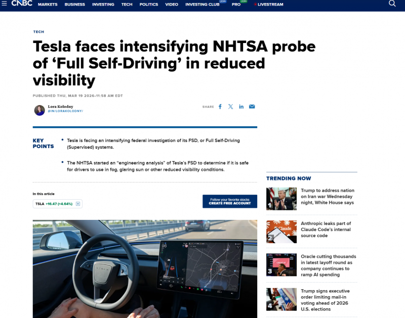 近期,美国国家公路交通安全管理局(NHTSA)升级了对特斯拉“完全自动驾驶”(FSD)系统的调查,直指FSD在雾天、强光等低能见度路况中,存在摄像头无法有效检测异常、预警滞后等安全隐患,可能涉及召回美国市场超320万辆车辆。